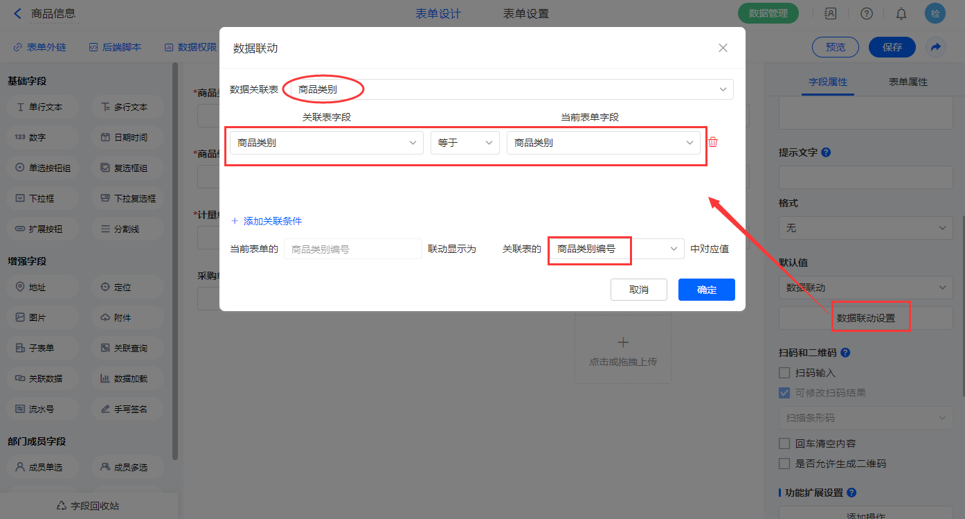 3)【商品类别编号】字段,设置默认值为数据联动,设置联动条件及联动字段;
