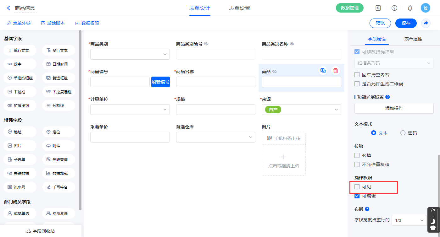 2.2、表单【商品信息】字段及表单属性设置