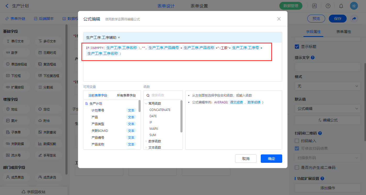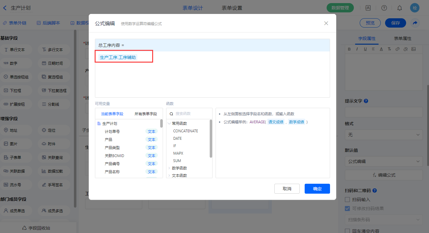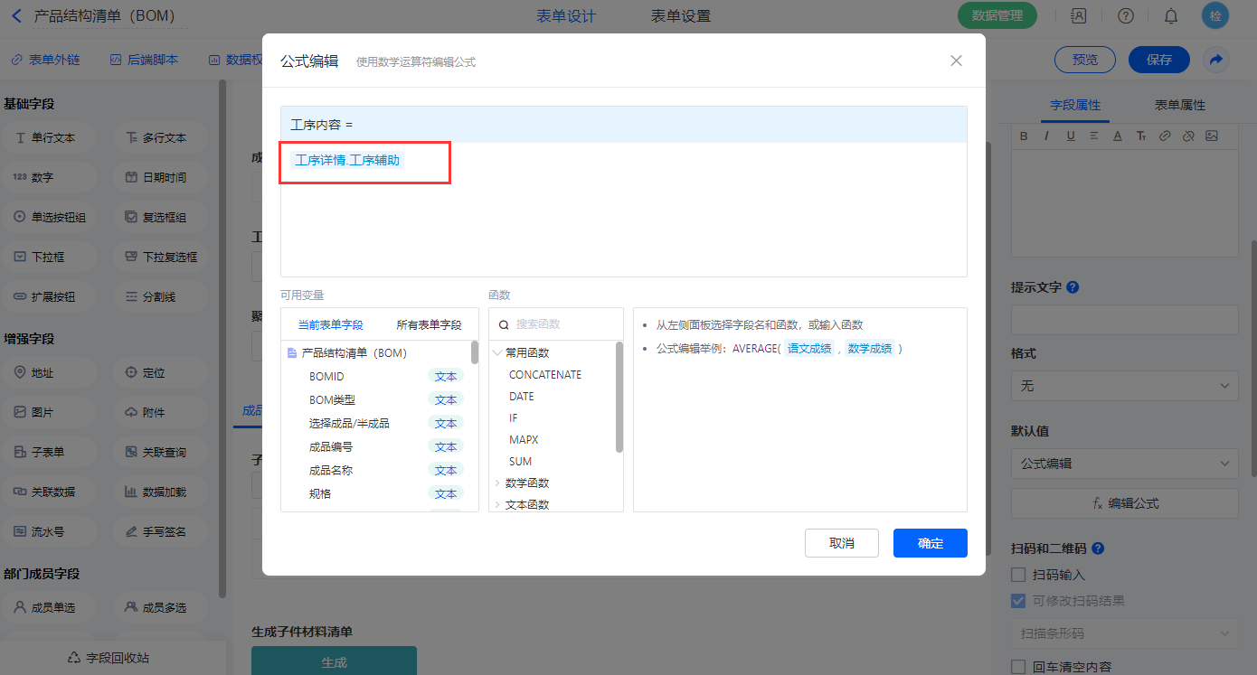 【工序详情.工序辅助】字段,设置默认值为公式编辑,如图设置公式;