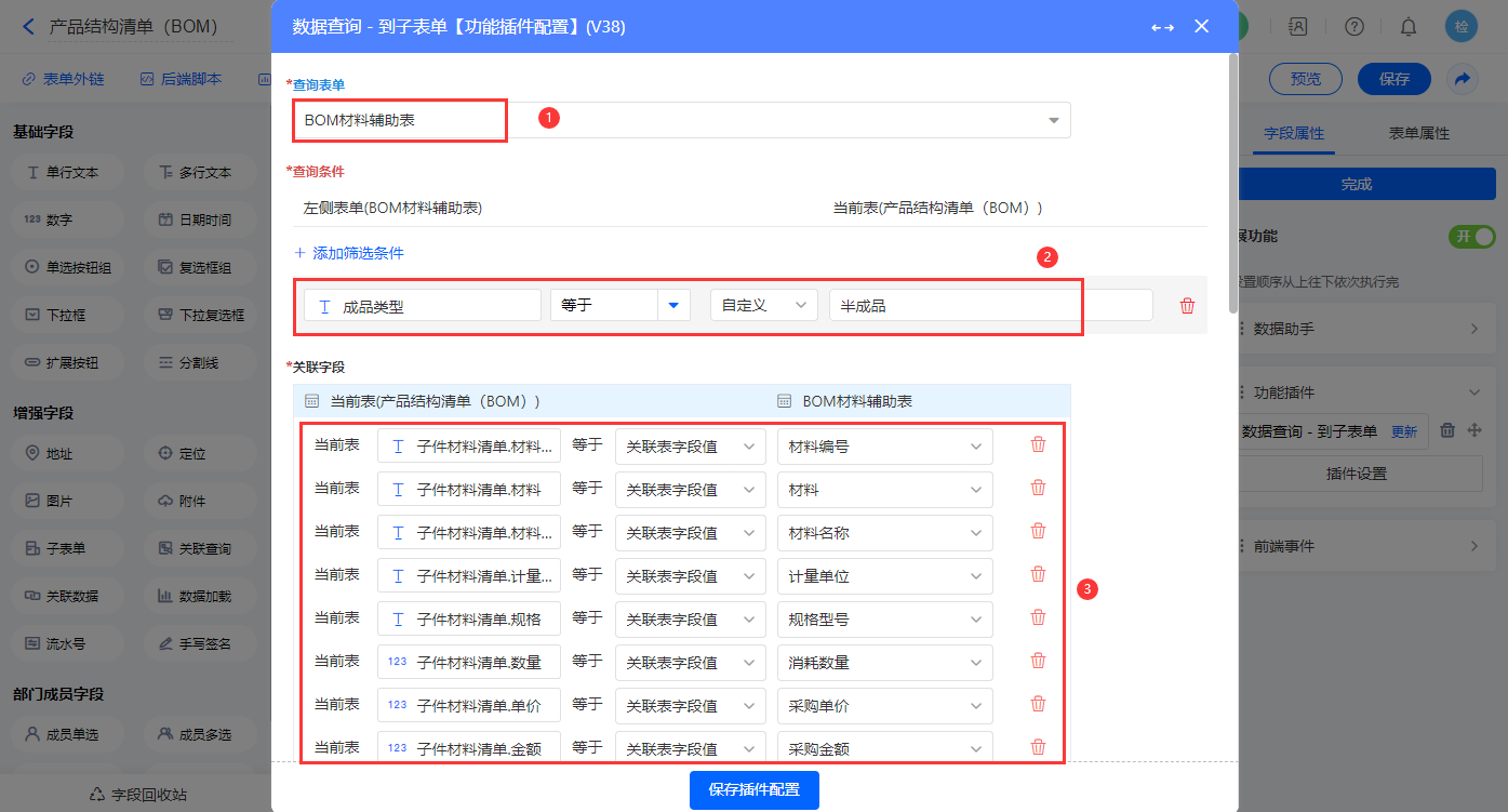 选择目标表单【BOM材料辅助表】,设置对应赋值字段;