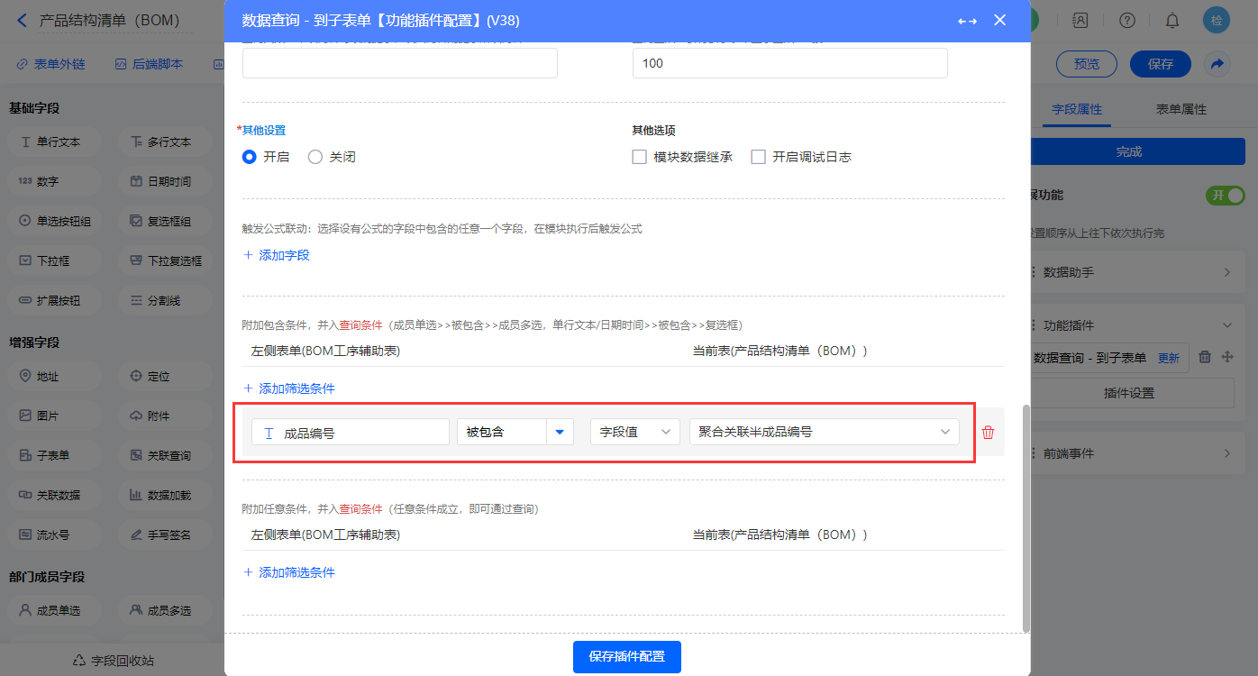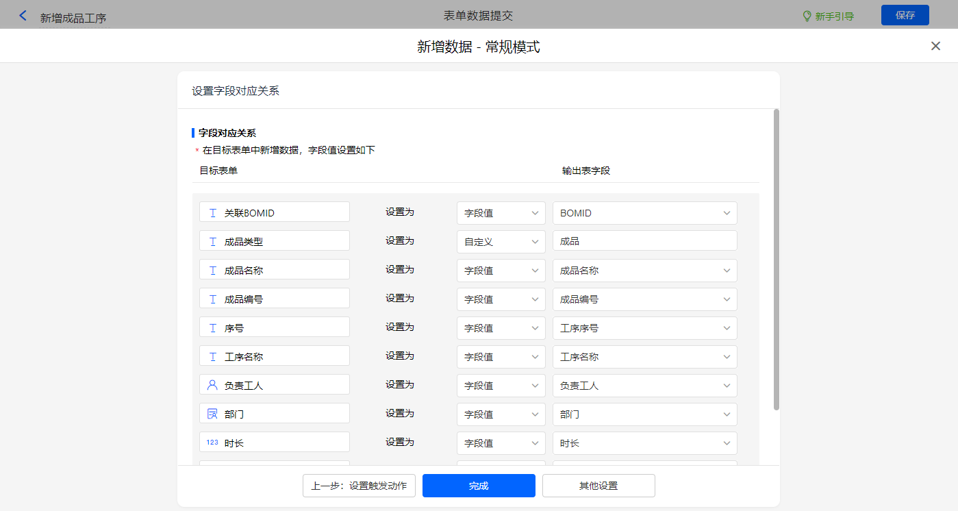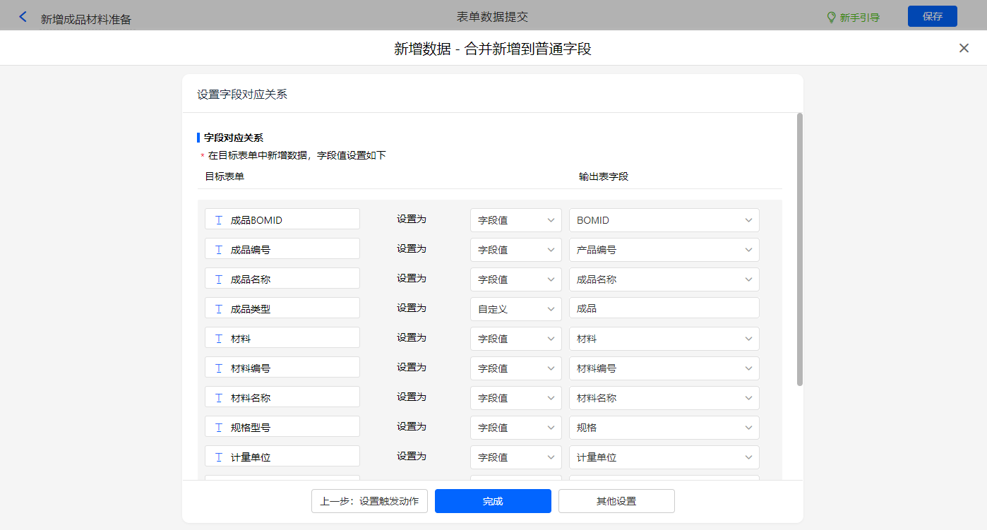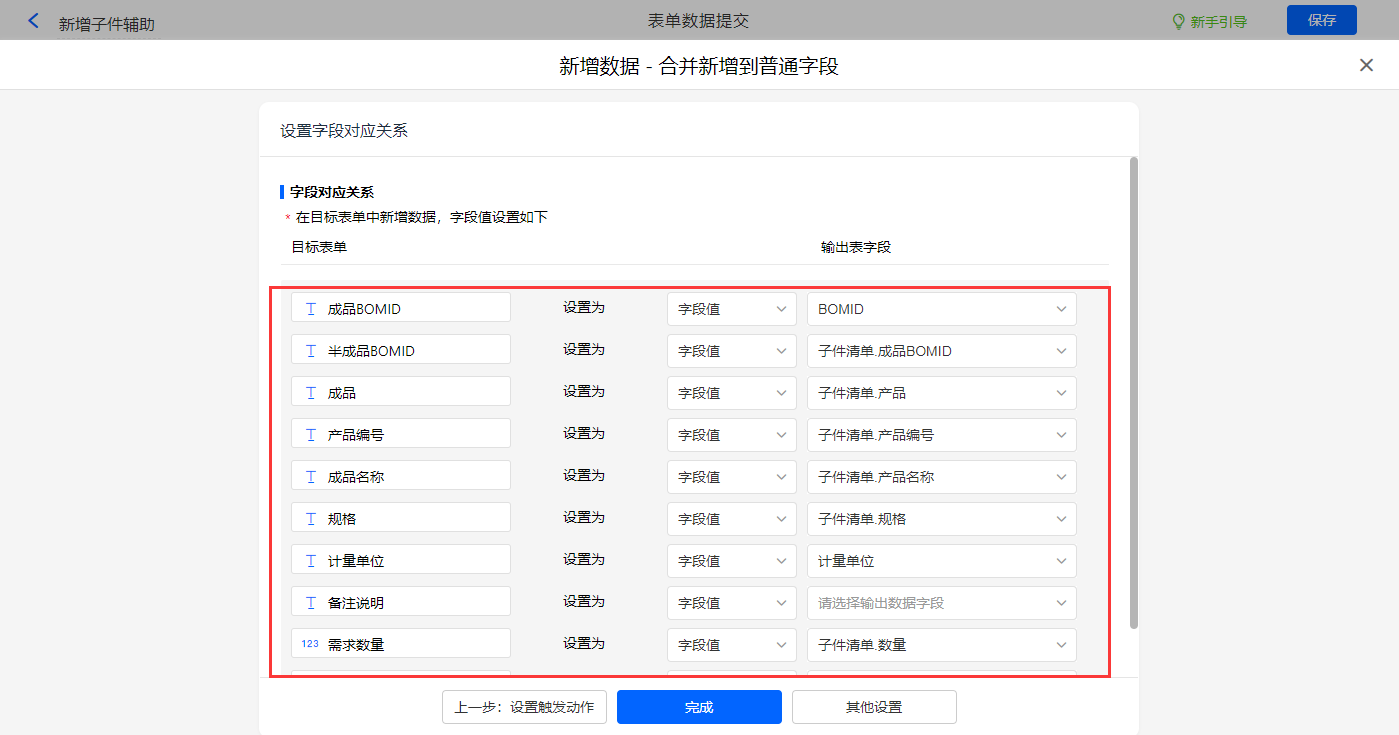 其他设置触发条件为【BOM类型】字段等于成品,设置好点击【完成】并保存该数据助手;