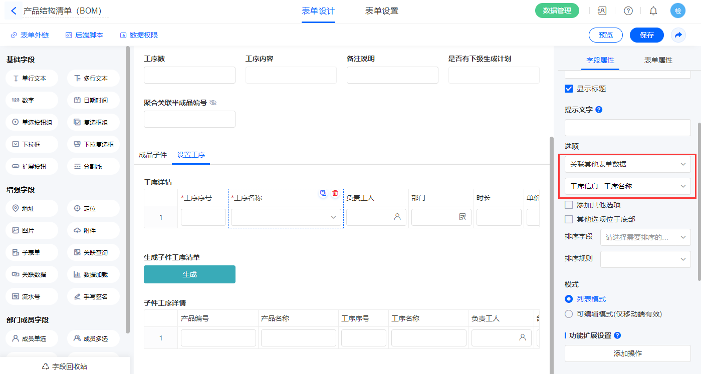 6)【工序详情.工序名称】字段,选择设置为关联其他表单数据,关联工序信息的【工序名称】字段;