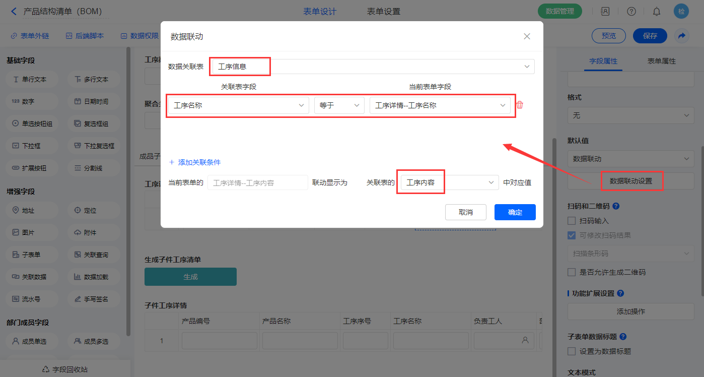 7)【工序详情.负责工人】、【工序详情.部门】、【工序详情.时长】、【工序详情.单价】、【工序详情.工序内容】以上字段设置默认值为数据联动,关联表及关联条件相同,设置对应的联动字段即可;