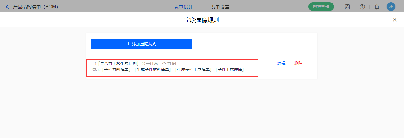 8)表单属性设置显隐规则,当【是否有下级生产计划】字段等于有,显示【子件材料清单】、【生成子件材料清单】、【生成子件工序清单】、【子件工序详情】字段;