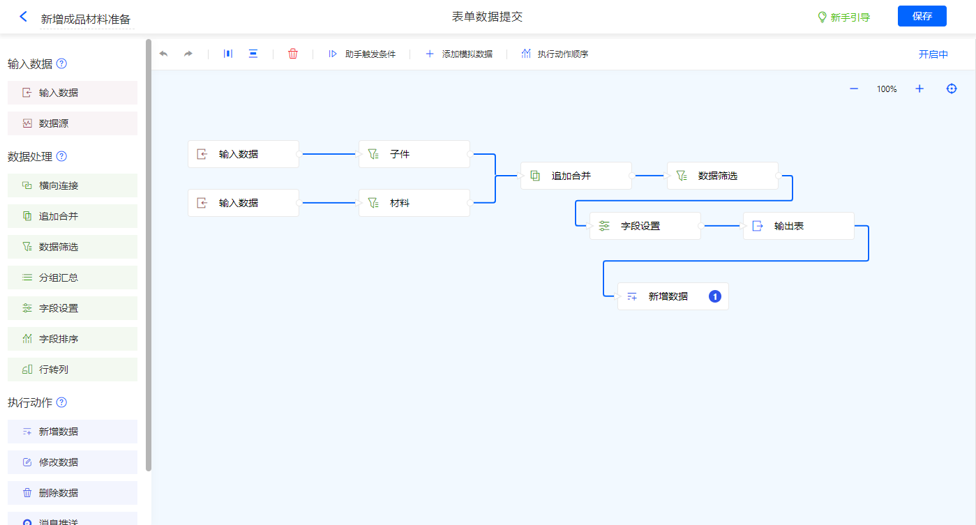 名称为新增成品材料准备的数据助手,新增新增数据执行动作,通过数据处理得到输出表;