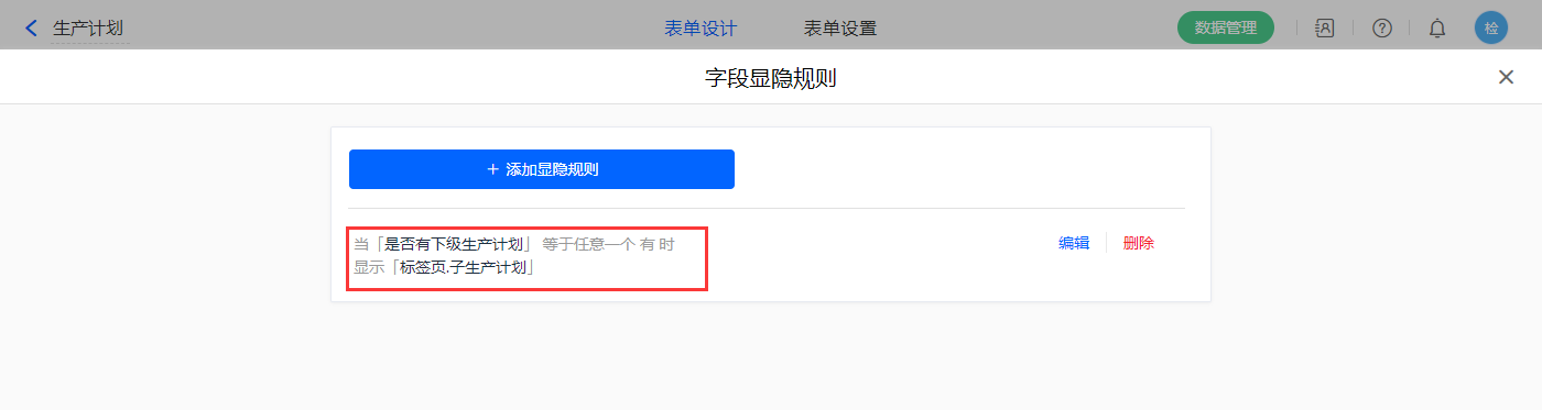 7)表单属性设置显隐规则,当【是否有下级生产计划】字段等于有,显示【标签页.子生产计划】字段;