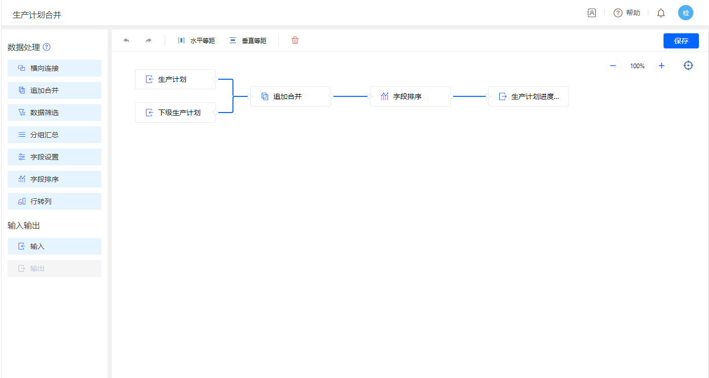 名称为新增计划成品辅助的数据助手,新增新增数据执行动作,通过数据处理得到输出表;
