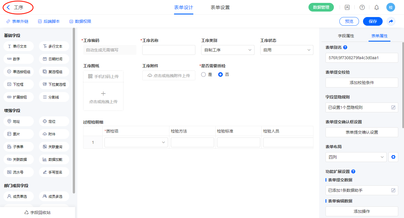 6)新增表单【工序过程检辅助表】,字段设置如下;