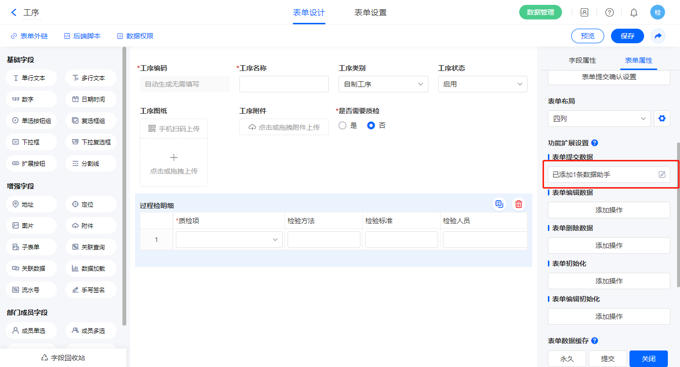 名称为新建工序质检辅助,新增新增数据执行动作,选择目标表单【工序过程检辅助表】,设置对应赋值字段,设置好点击【完成】并保存该数据助手;
