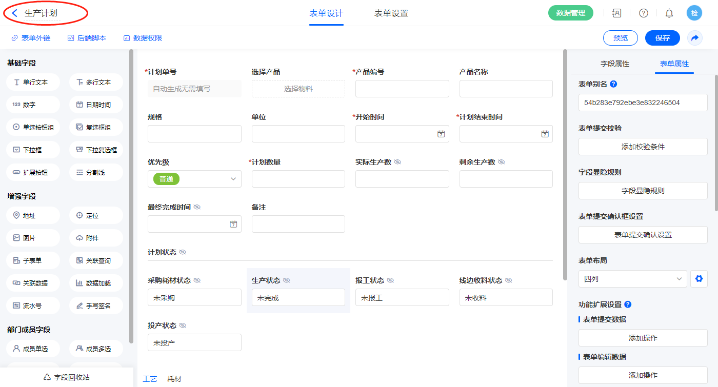 4)【实际生产数】、【剩余生产数】、【最终完成时间】、【采购耗材状态】、【生产状态】、【报工状态】、【线边收料状态】、【投产状态】、【物料清单.单个耗材数】设置操作权限为不可见;