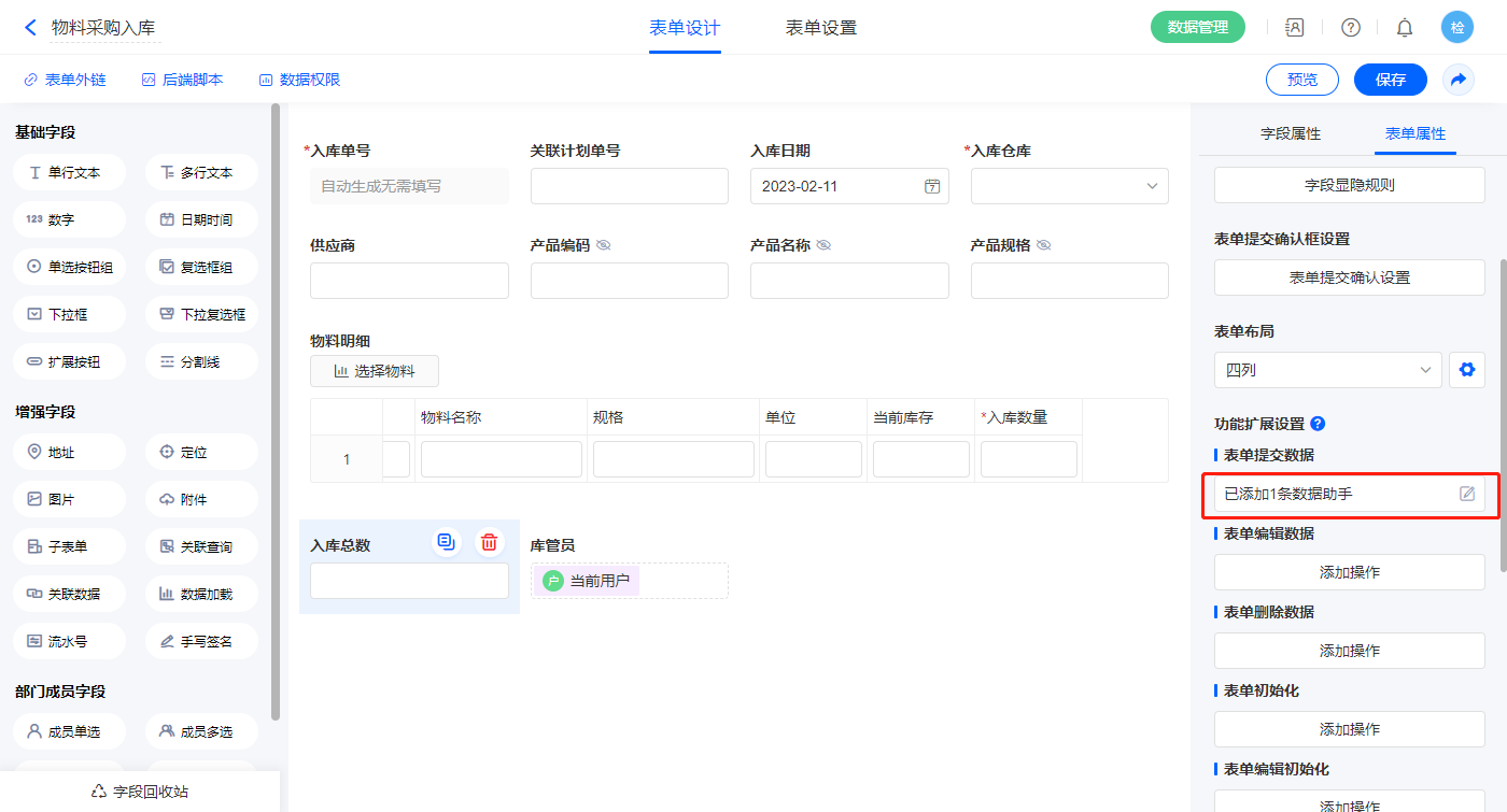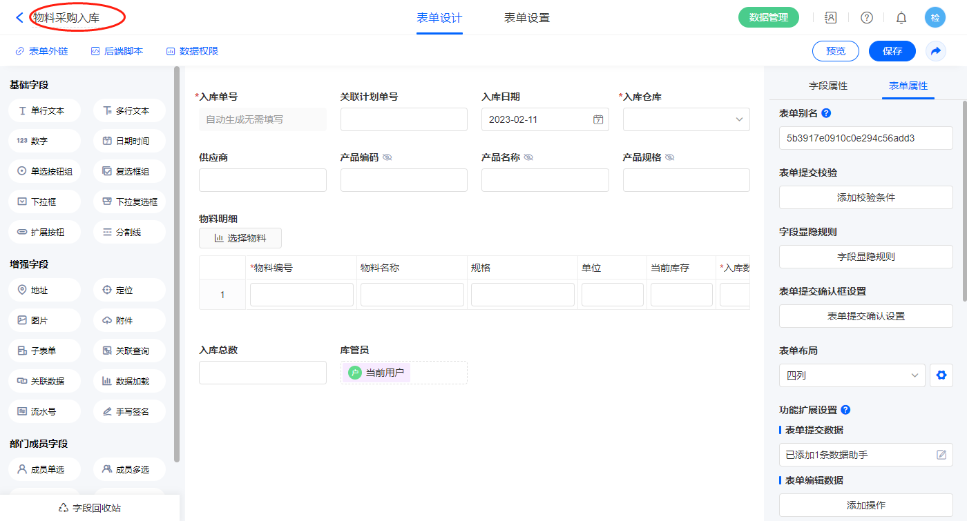 4)【入库总数】字段,设置默认值为公式编辑,如图设置公式;