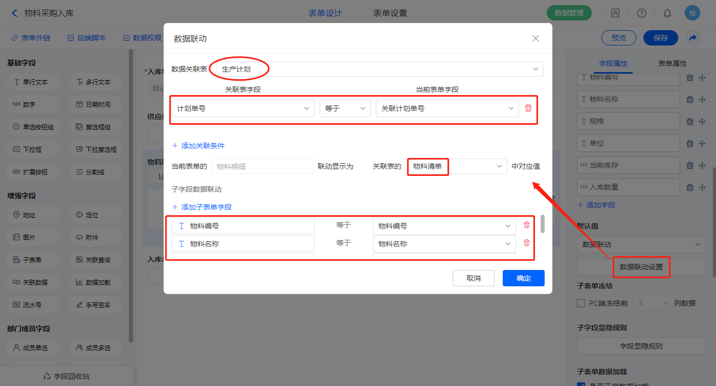 【投产物料明细】子表单字段,设置默认值为数据联动,设置联动条件及联动字段;