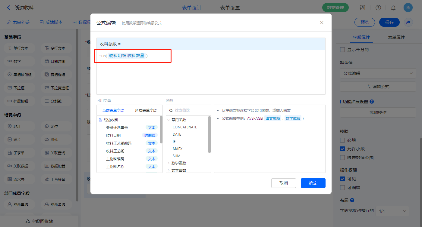5)【收料总数】字段,设置默认值为公式编辑,如图设置公式;