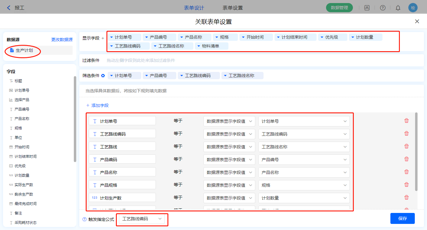 1)【报工计划】数据加载字段,数据源为【生产计划】,添加显示字段设置赋值字段及筛选条件,触发指定公式为【工艺路线编码】字段,设置完点击保存;