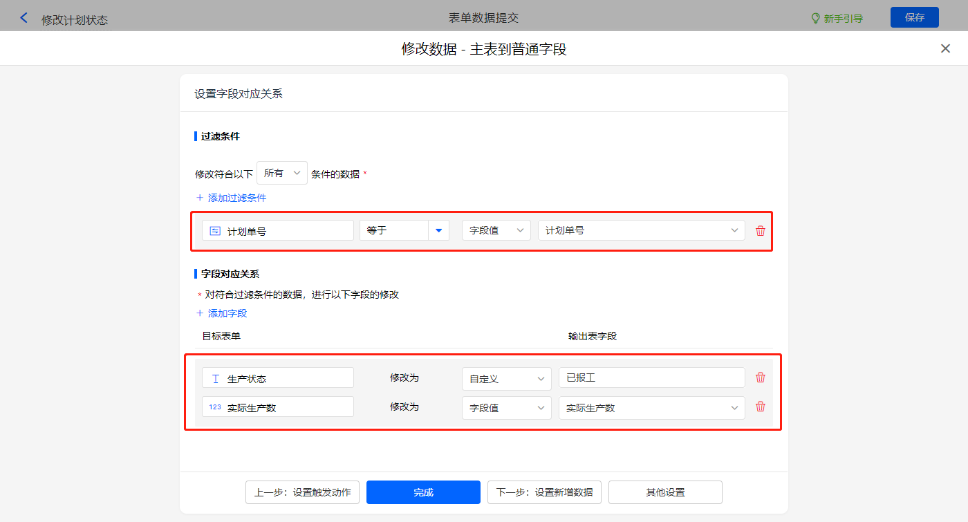 名称为修改生产状态,新增修改数据的执行动作,选择修改【生产计划】表单,选择对应过滤条件,以及需要修改的字段,设置好点击【完成】并保存该数据助手;