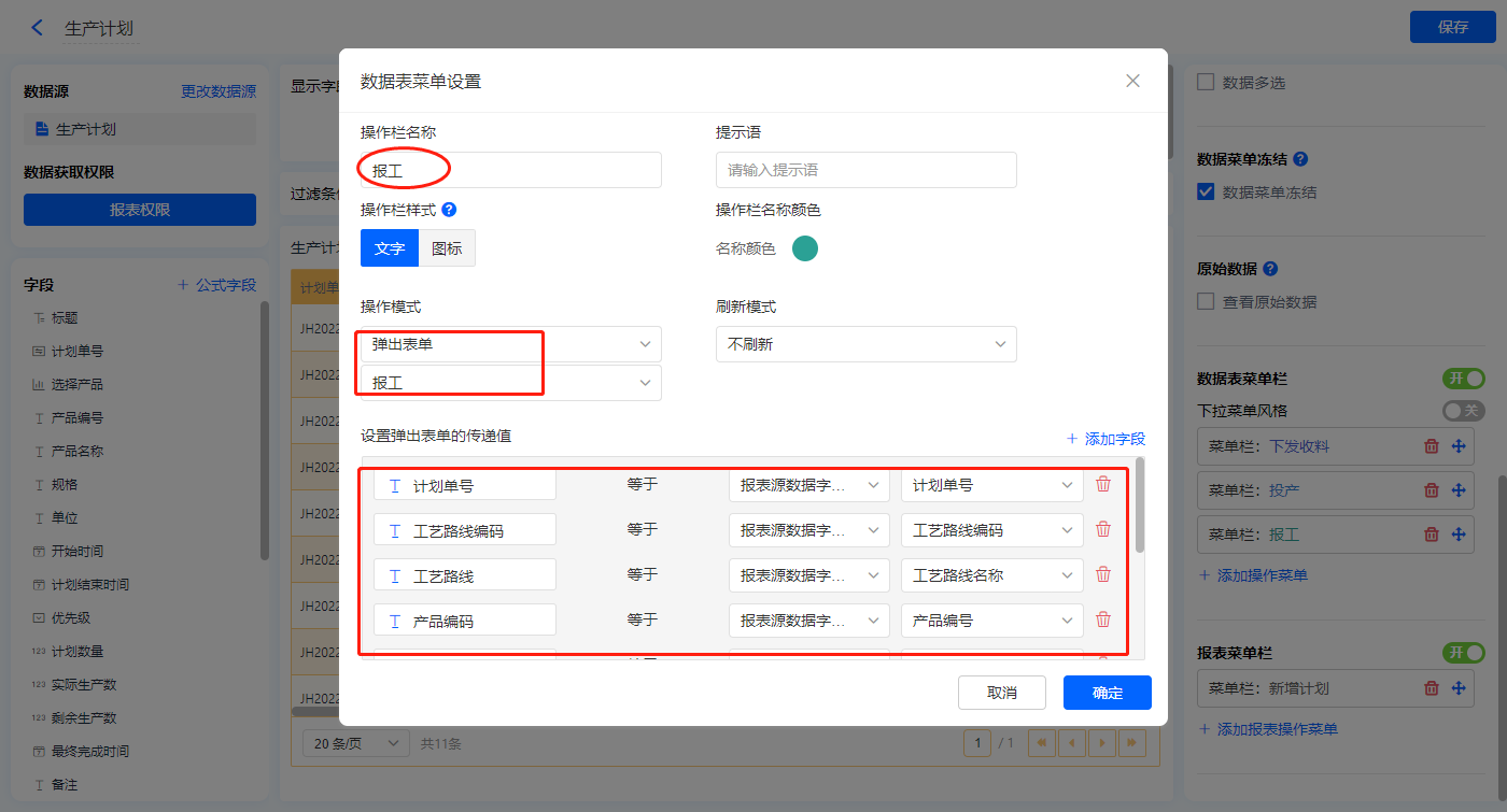 【报工】菜单栏,操作模式设置为弹出表单【报工】;