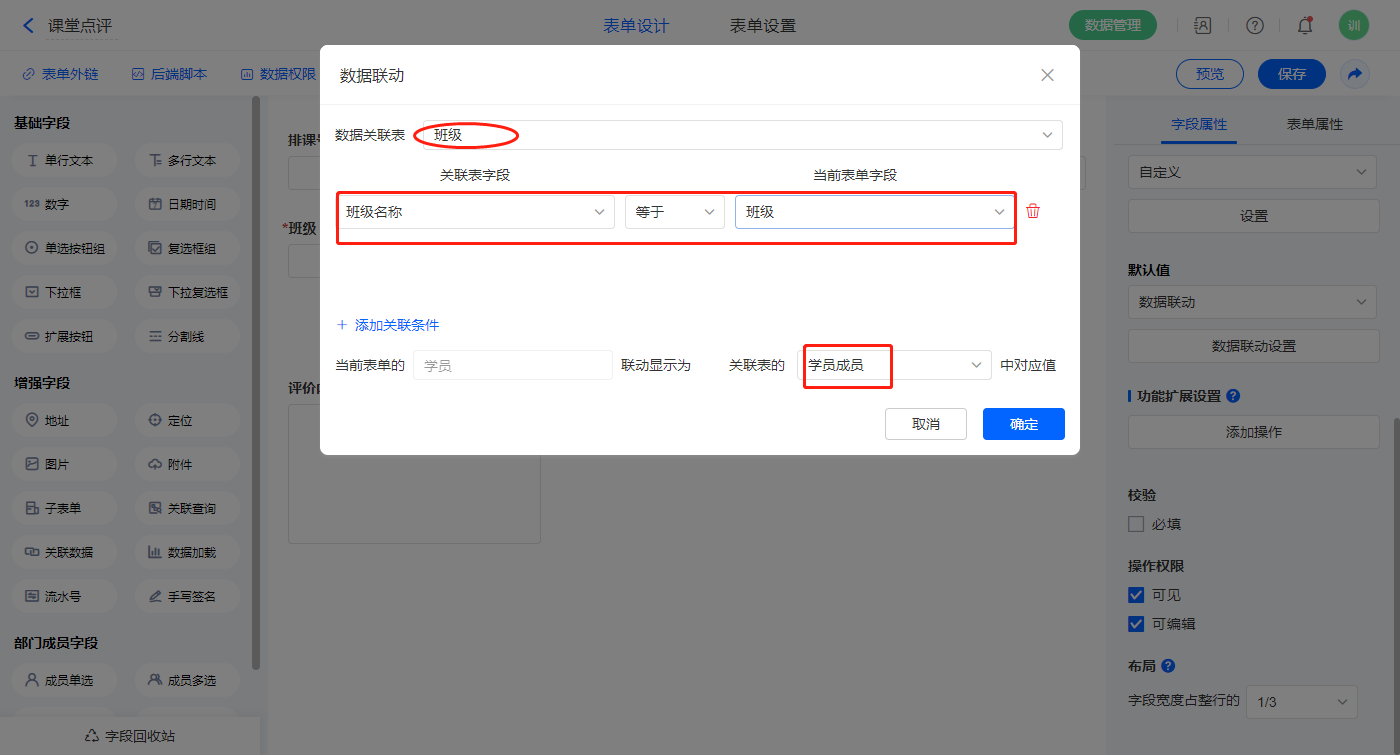 1)【班级学员】字段,设置默认值为数据联动,设置联动条件及联动字段,该字段为不可见字段;