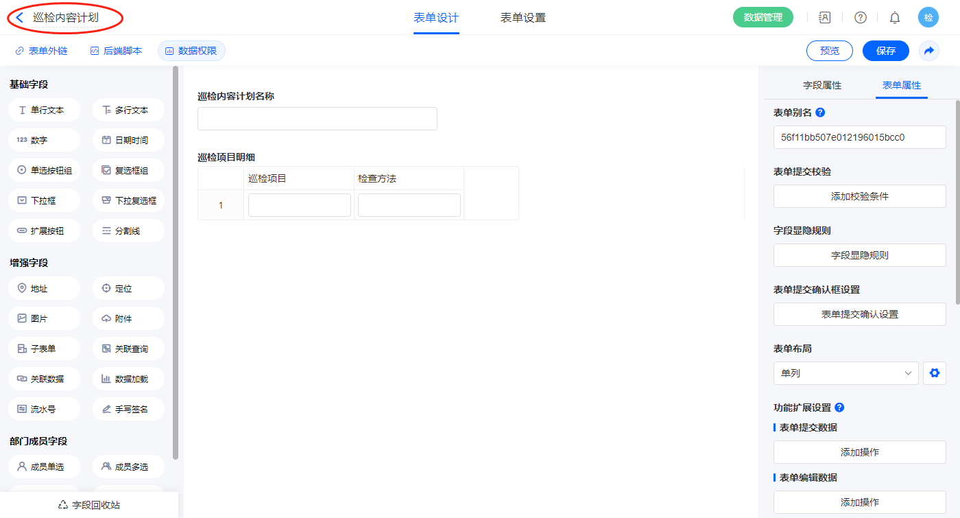 | 巡检时间计划 | 单行文本 | 巡检人员 | 成员单选 |