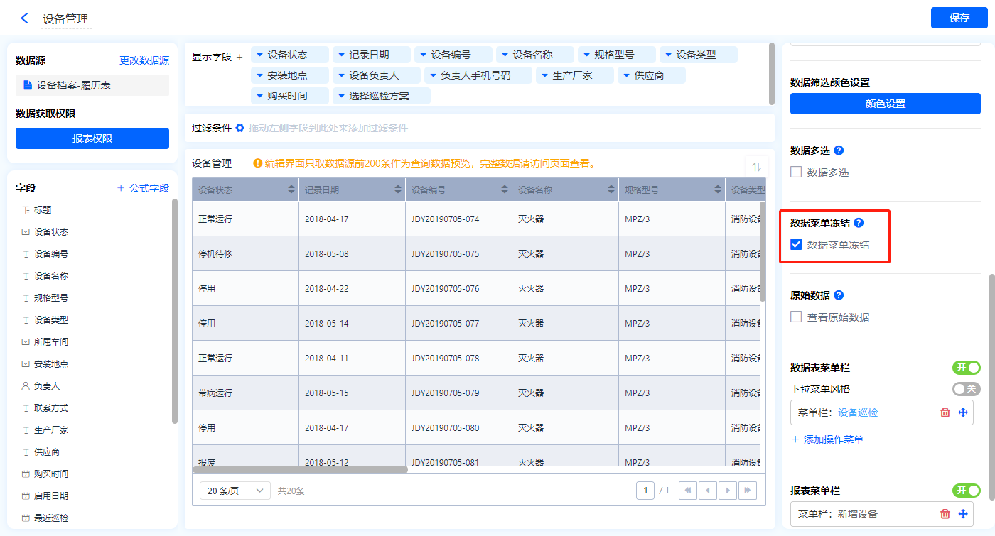 1)【选择设备】数据加载字段,数据源为【设备档案-履历表】,添加显示字段设置赋值字段,触发公式为【设备编号】字段,设置完成点击保存;