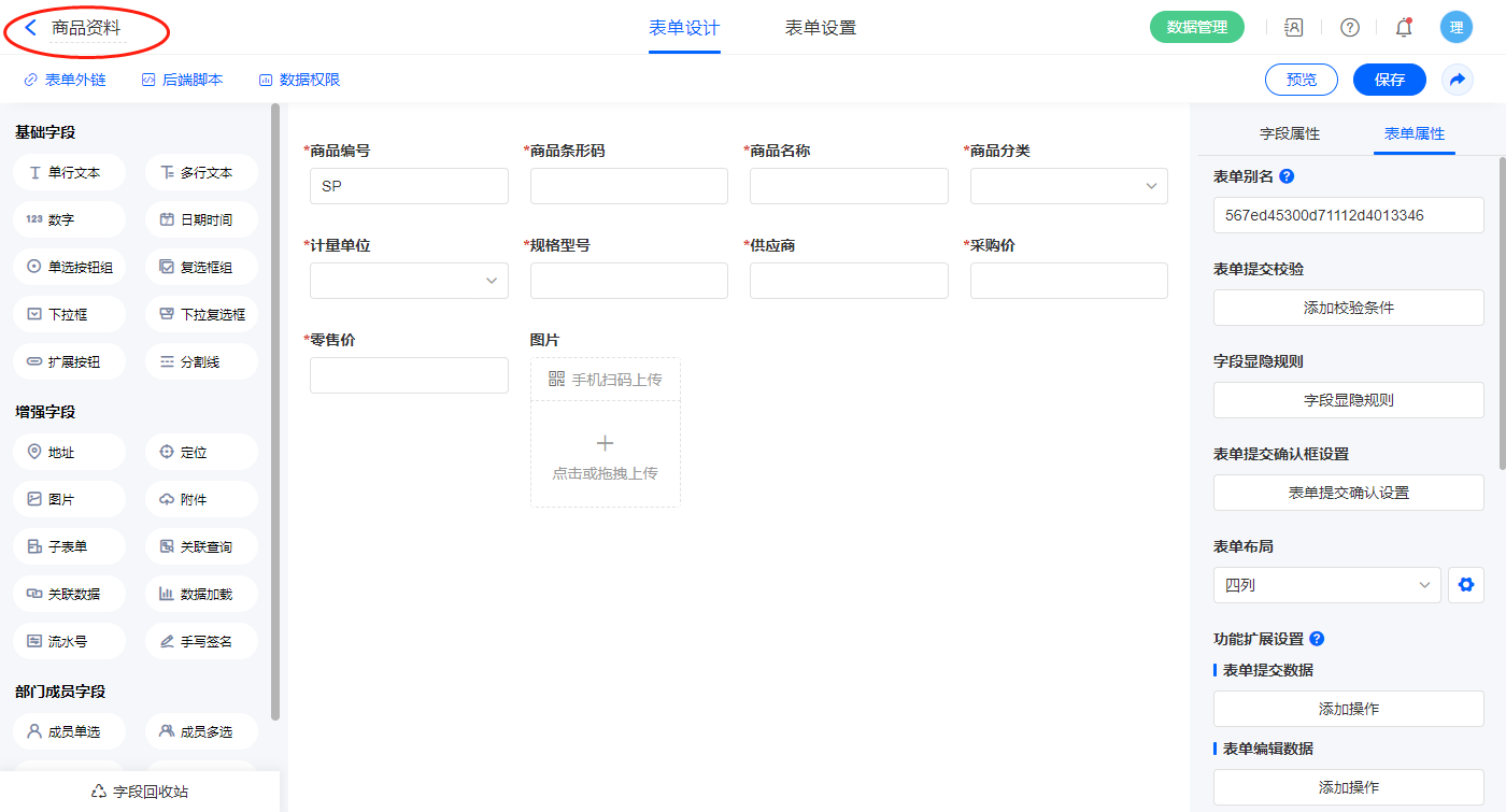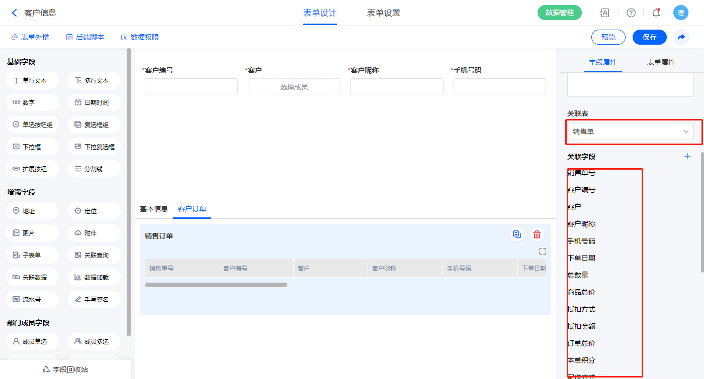 1)【销售单号】字段,选择设置为关联其他表单数据,关联销售单的【销售单号】字段;