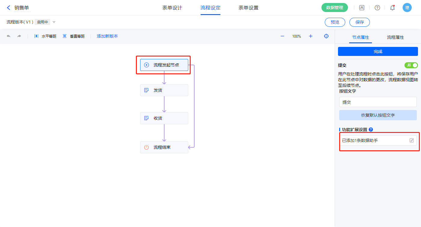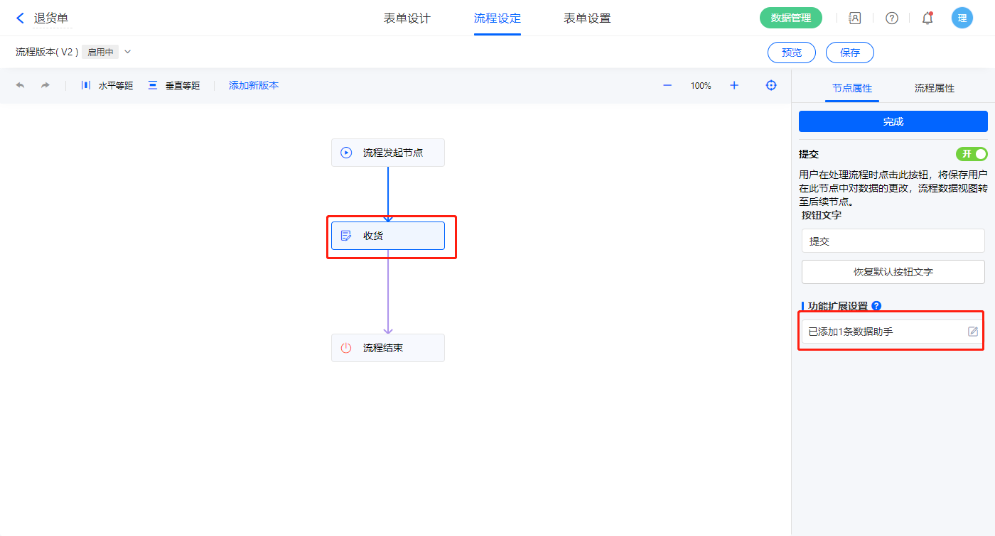 5)该表单为流程表单,设置好流程陈节点,收货节点提交设置一条数据助手,名称为退回优惠券;