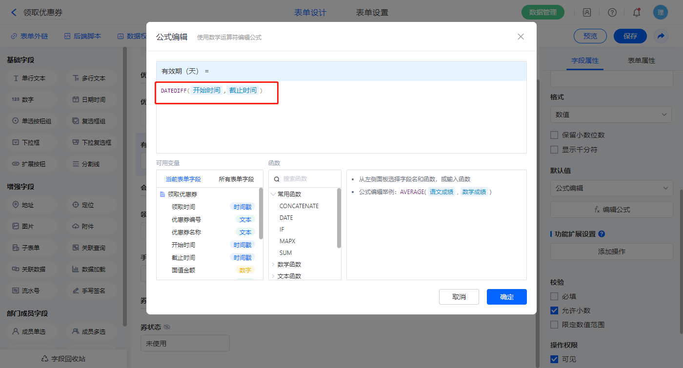 1)【有效期(天)】字段,默认值选择公式编辑,如图设置公式;