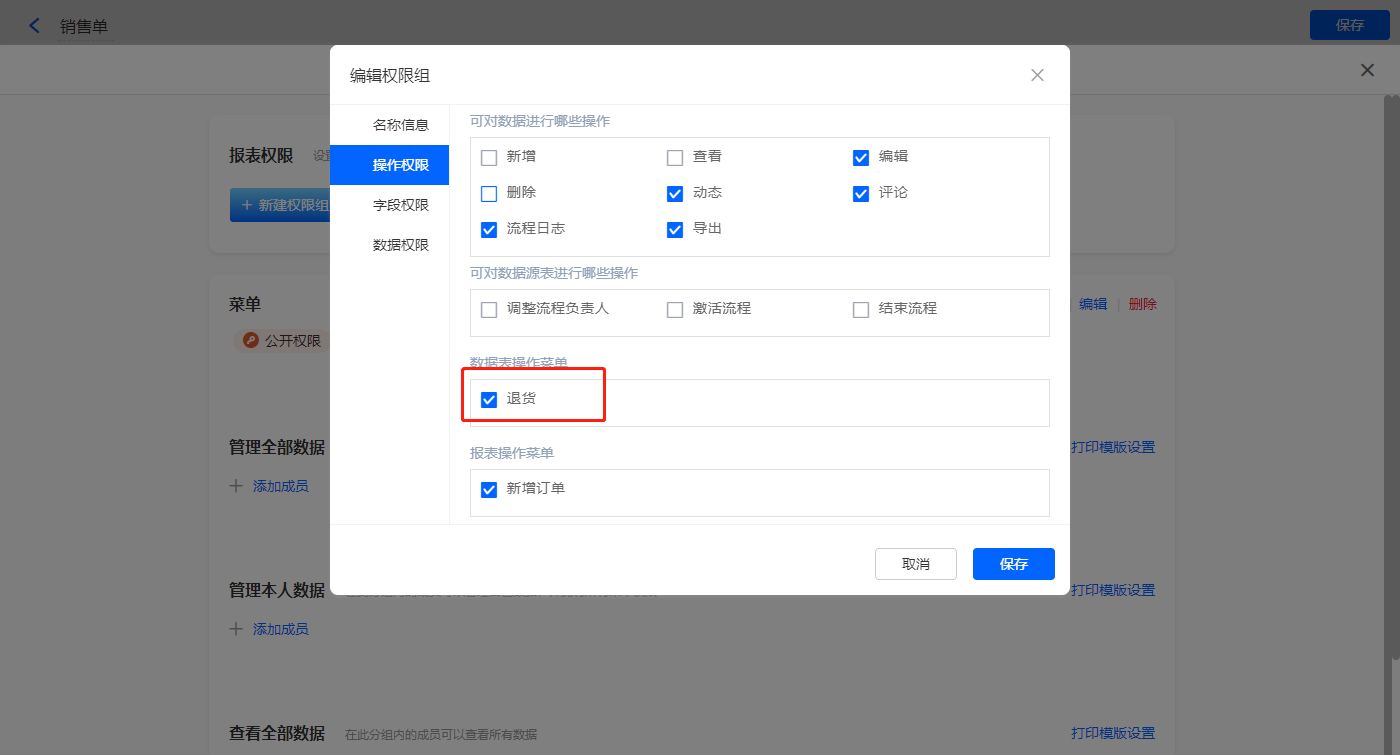 3)设置报表的权限,填入权限组名称,选择可操作的数据表菜单,点击【保存】;