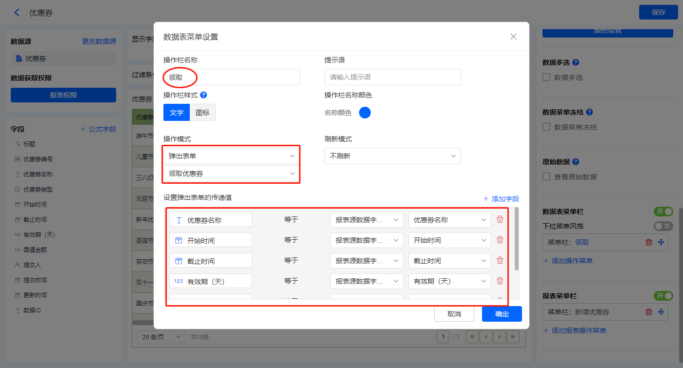 【领取】的菜单栏,操作模式设置为弹出表单【领取优惠券】;