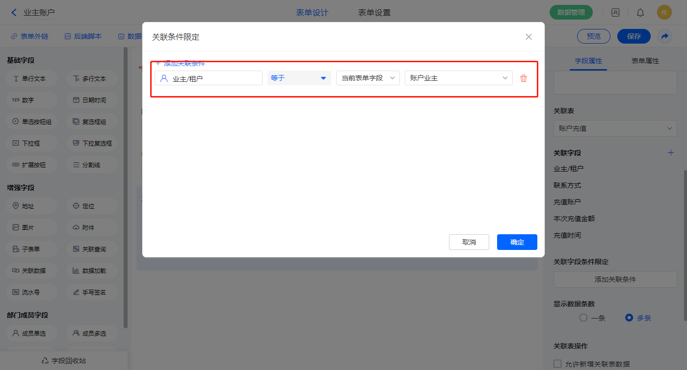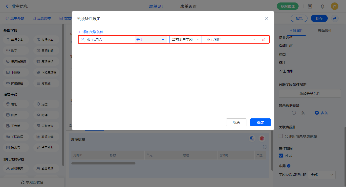 设置关联条件,【业主/租户】字段作为关联条件;;