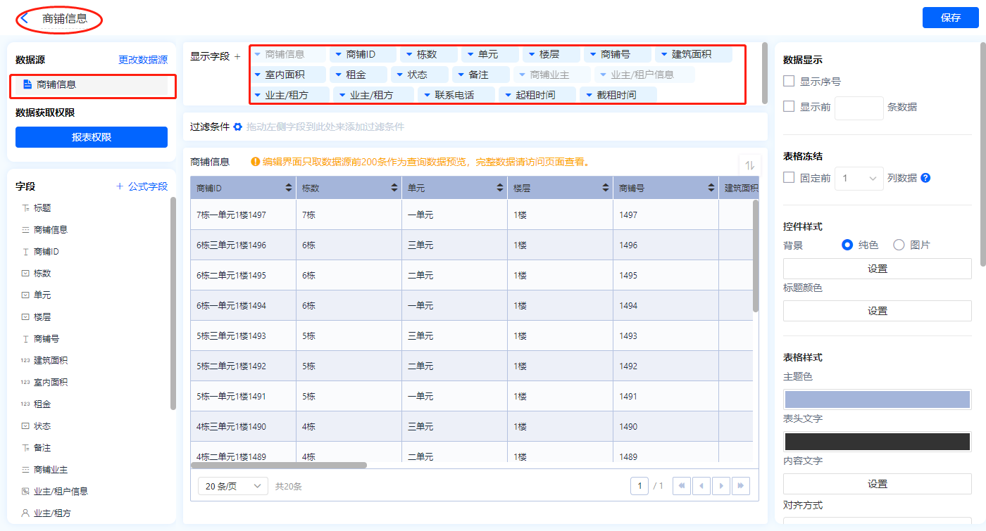 1)新增【业主管理】报表,用基础报表【数据表】展示数据源为表单【业主信息】的数据;