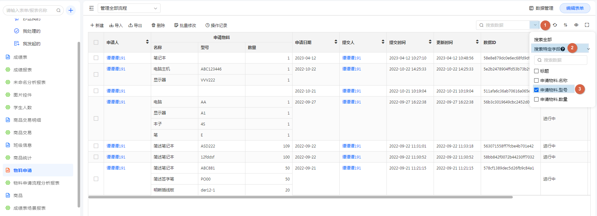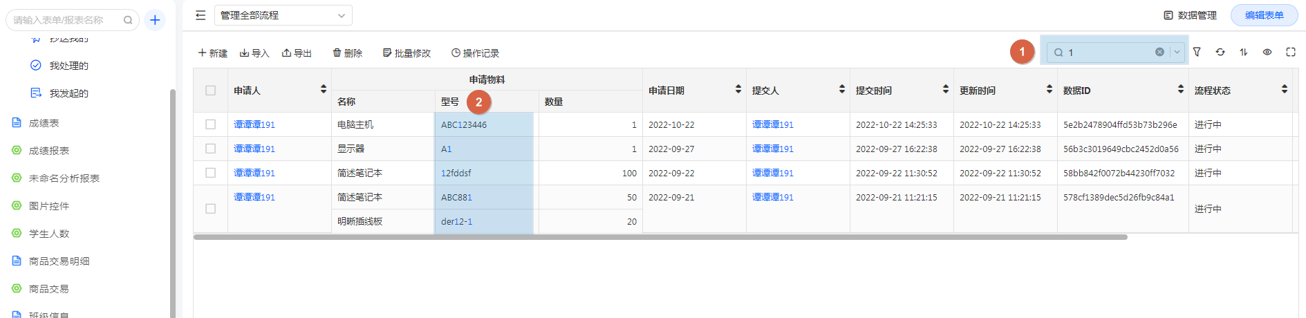1)数据量小于或等于 1 万时,支持全局搜索&特定字段搜索;全局搜索时,最多对表单前 100 个符合搜索规则的字段进行搜索。