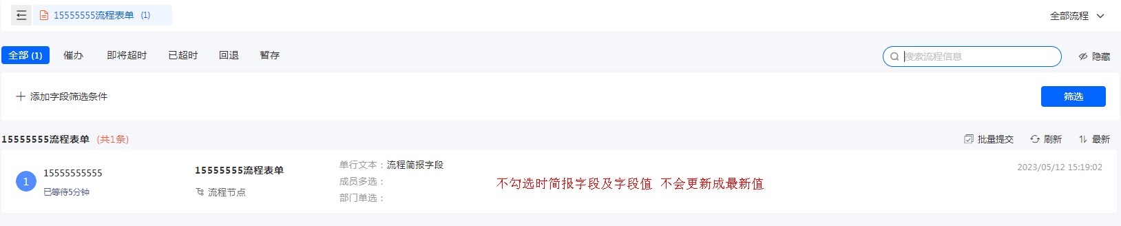 勾选后流程简报使用最新字段及字段值,不勾选则使用最先收到任务时的数据,不会更新。