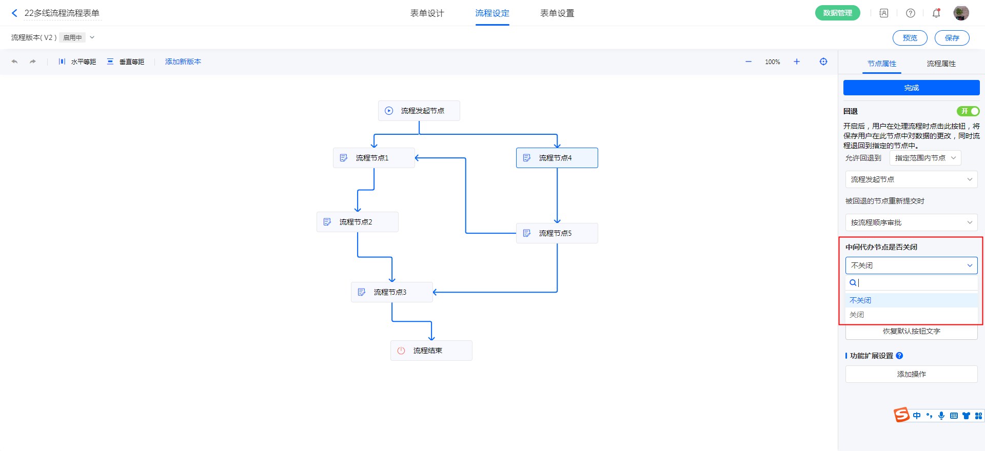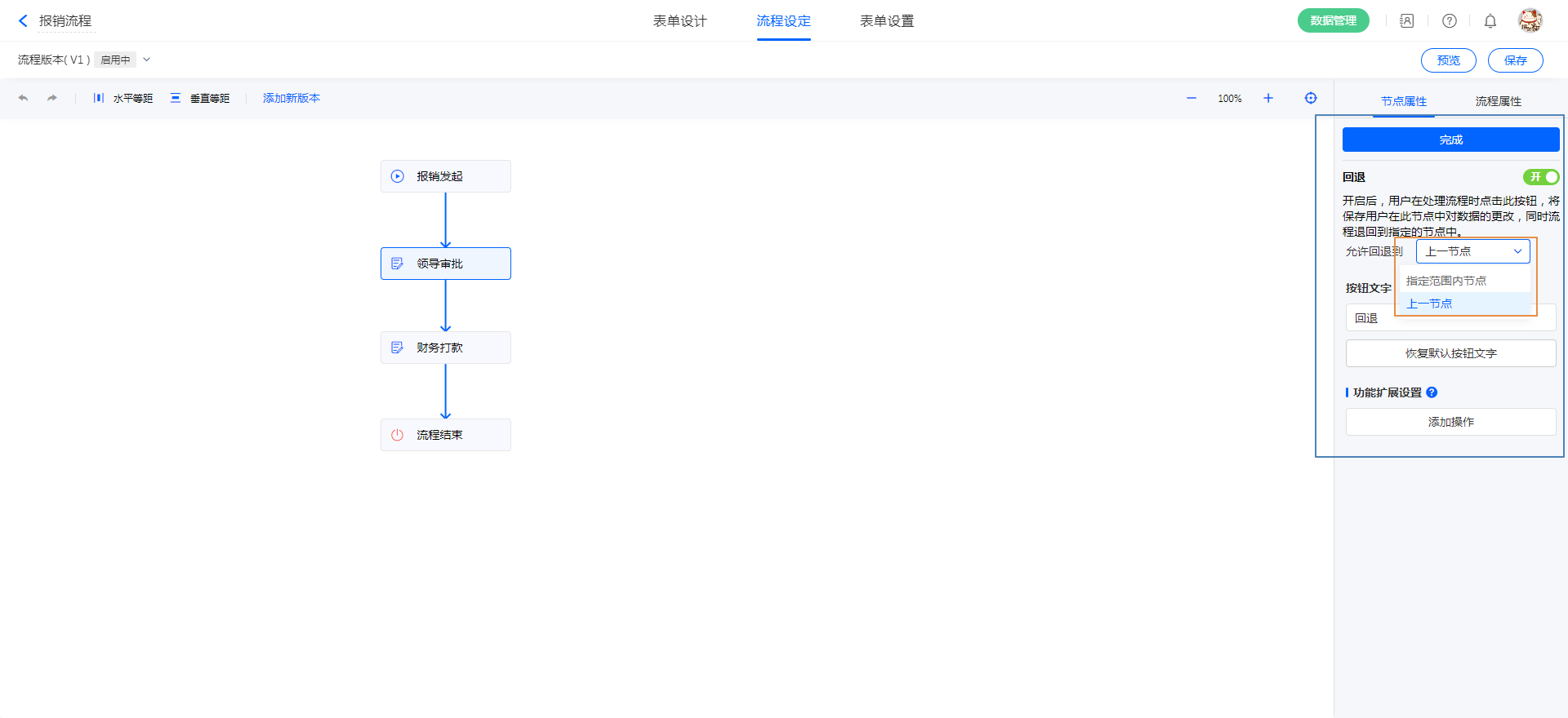 1)进入「流程设定」,选中需要设置回退的流程节点,在「节点属性 >> 更多属性 >> 节点操作」点击「回退」: