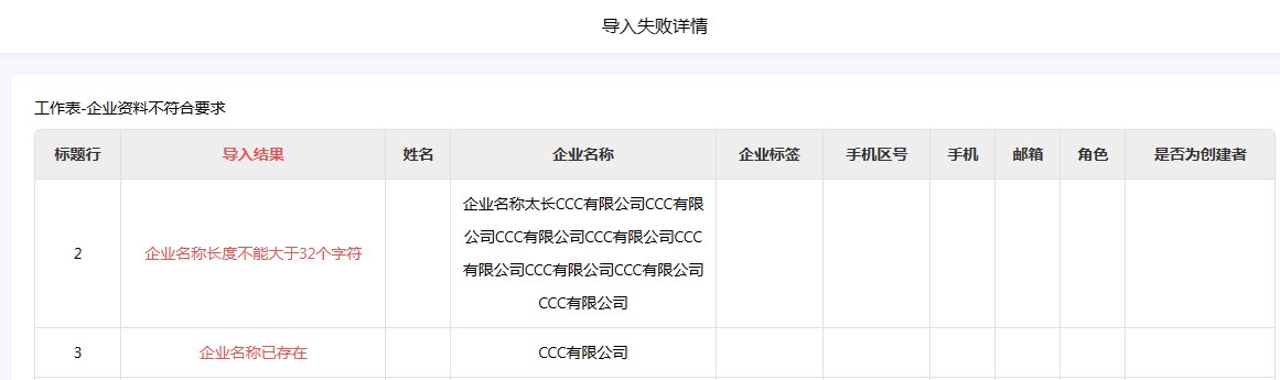 当创建者资料不符合要求时,会出现如下图所示的一种或多种报错,任意一种报错都会导致该企业无法导入成功: