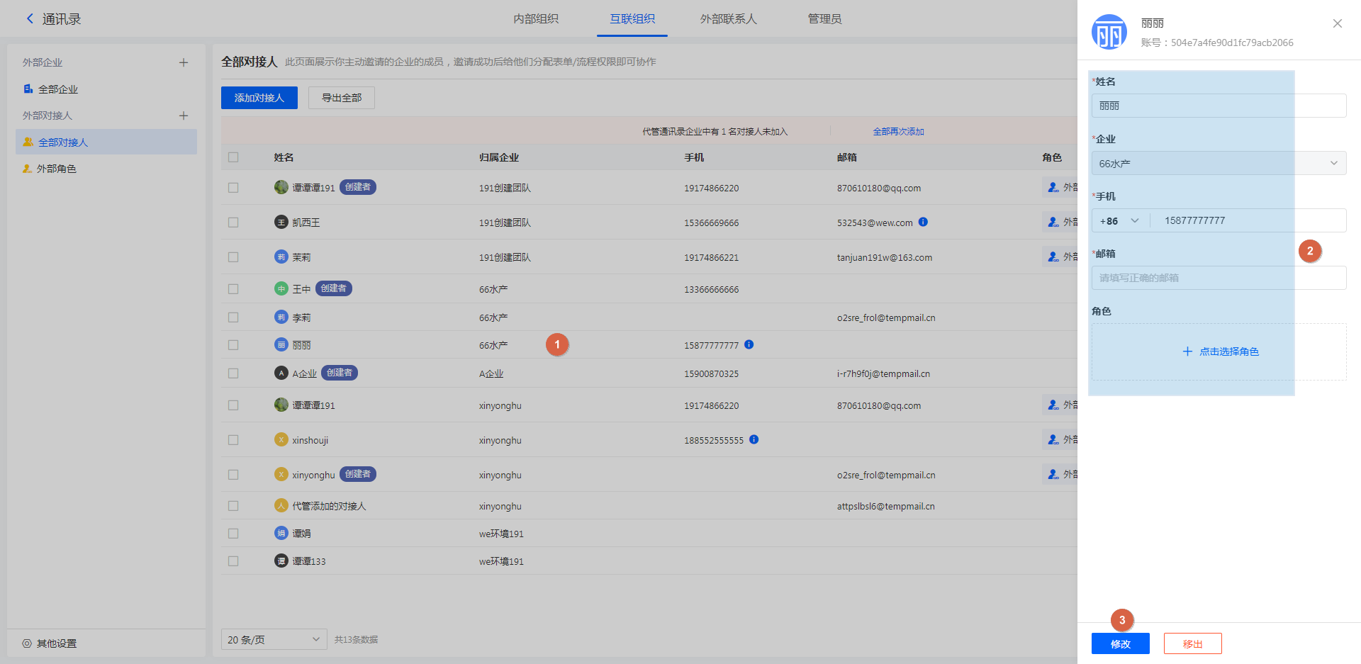 - 代管通讯录的企业:邀请中的对接人支持修改姓名、手机、邮箱及调整角色组;普通对接人支持修改姓名及调整角色组