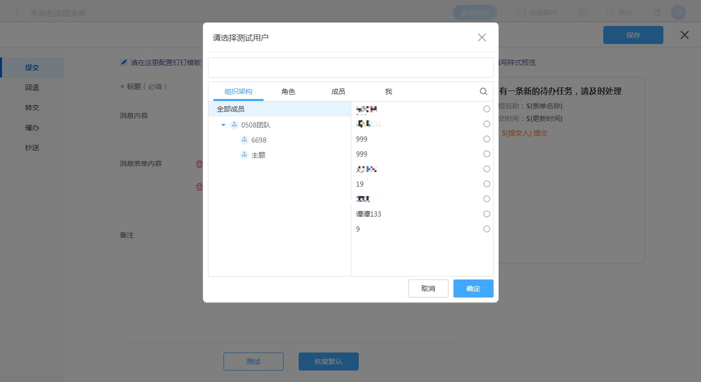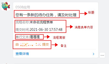 - 系统为流程表单的提交、回退、转交、催办、抄送五种场景类型设置了默认的消息模板。