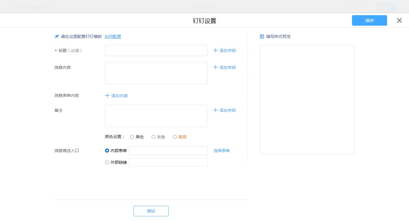 钉钉用户登录系统,在设计流程表单、普通表单、数据助手消息设置时选择钉钉提醒时,可设置钉钉消息模板。