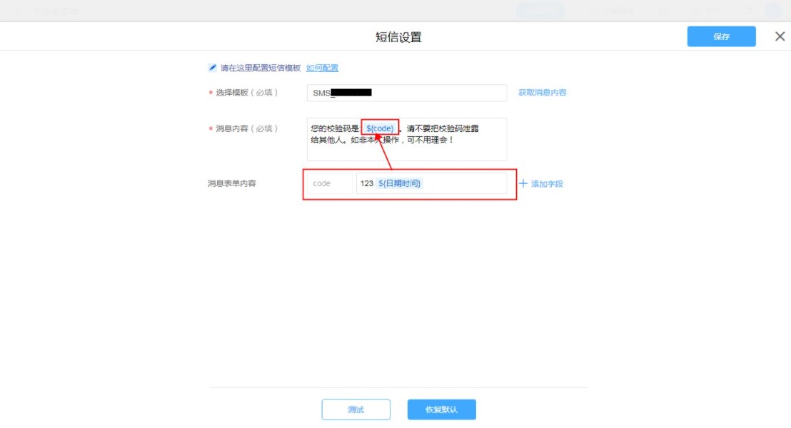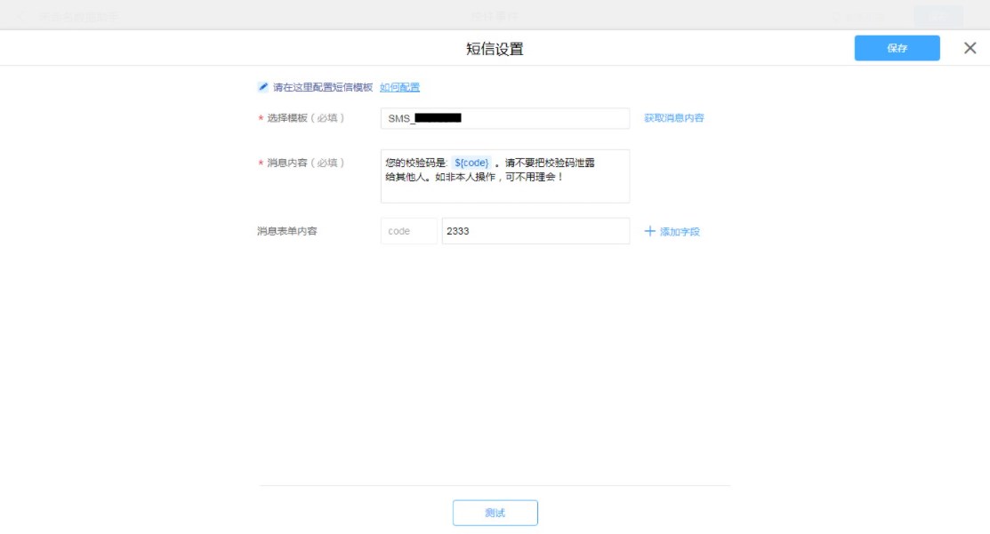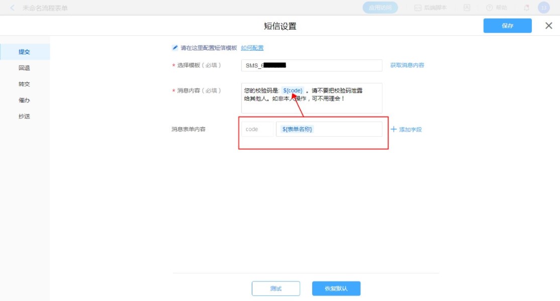 用户在设计流程表单、普通表单、数据助手消息设置时选择短信提醒时,可设置短信消息模板。