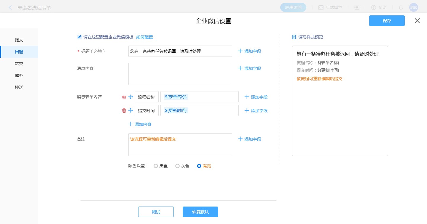 - 系统为流程表单的提交、回退、转交、催办、抄送五种场景类型设置了默认的消息模板。