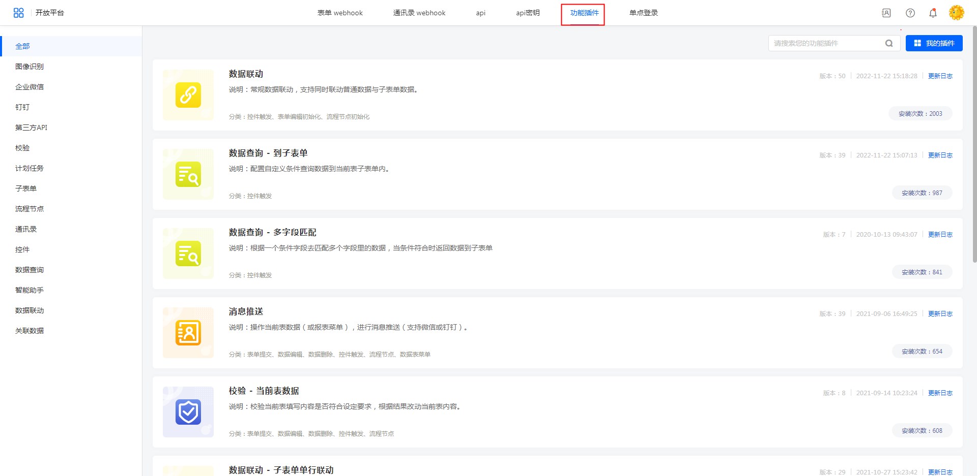 表单控件、表单属性、流程节点、报表菜单、计划任务等支持添加功能插件的位置