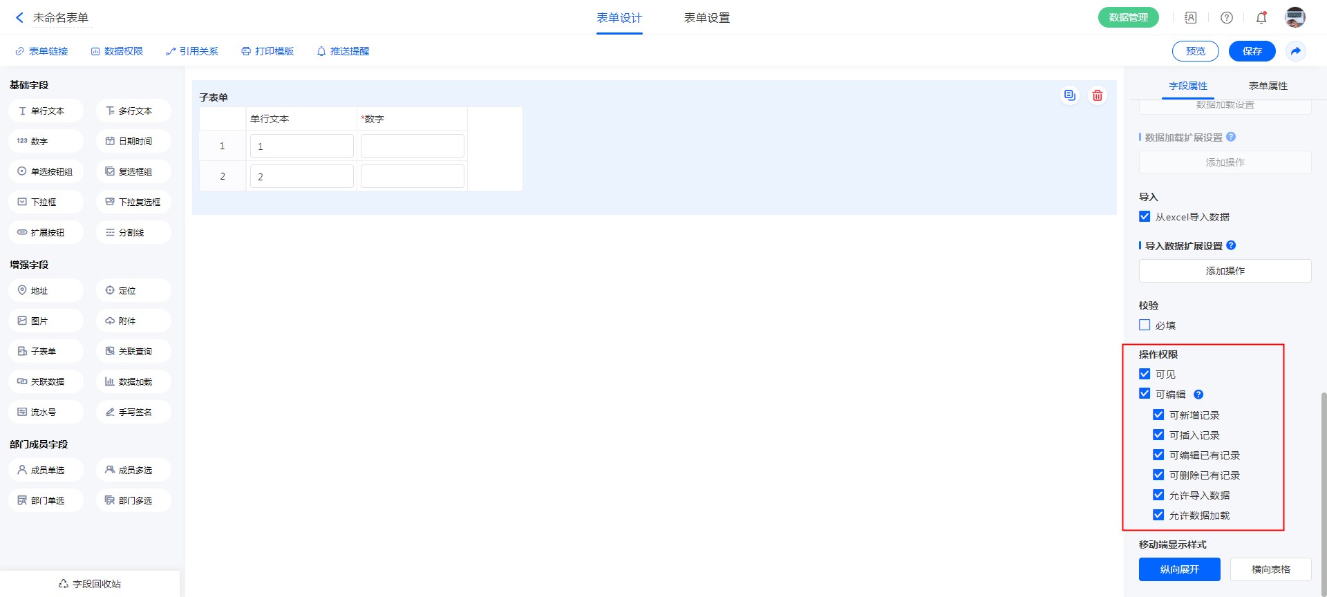 表单设计界面>>子表单「字段属性」>>字段权限>>可编辑下方操作权限;