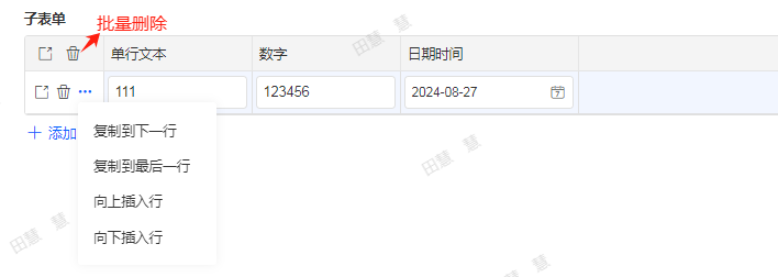| 可新增记录 | 可以在填写子表单时,可以新增一条记录在最后一行;也可以复制记录到最后一行 |