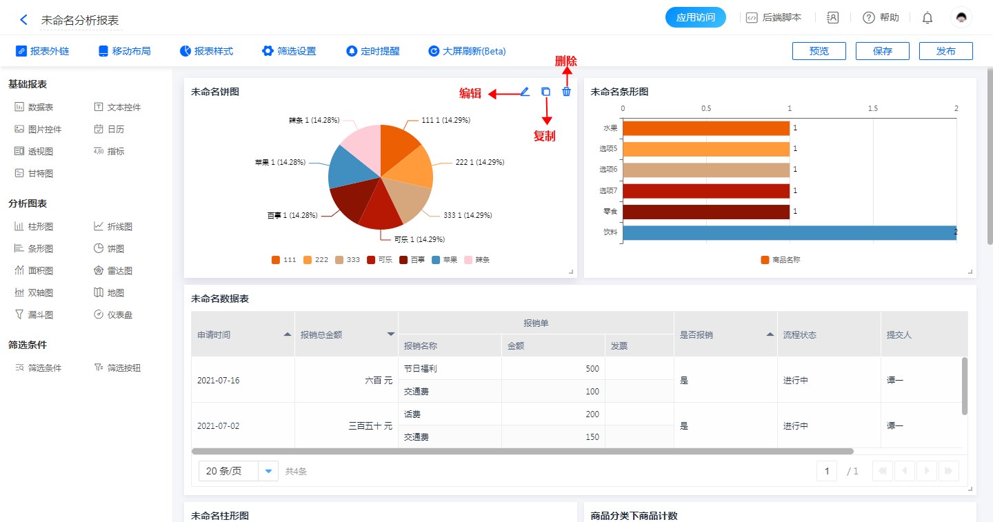 【管理应用】-【编辑报表】,如果在报表设计页面有多个图表,我们可以对图表进行复制或删除操作,图表的差异较少,直接复制可以减少我们的操作,提高图标设计的效率。如果图表不再需要可直接删除。