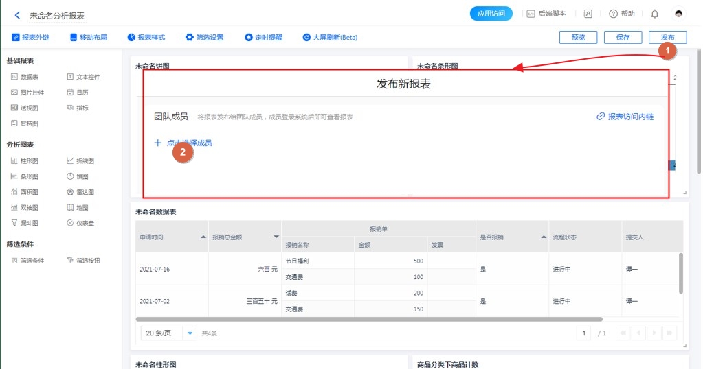 【管理应用】-【编辑报表】-【发布】,通过发布,可以将报表分享给团队成员,成员登录系统后,可以访问此报表。