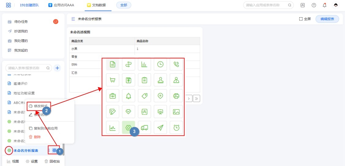 【管理应用】-【表单/报表列表下选择报表】,点击报表右侧的设置图标下的【选择样式】,可自定义不同样式的报表图表。
