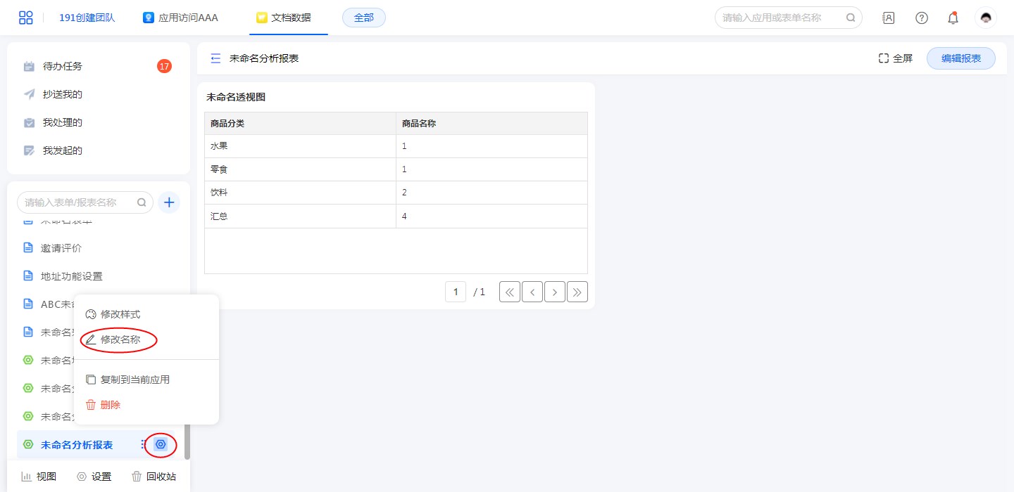 【管理应用】-【表单/报表列表下选择报表】,点击报表右侧的设置图标下的【修改名称】,可自定义报表名称。