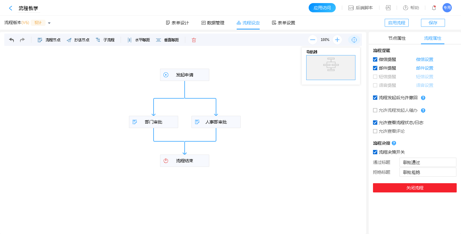 节点选择按比例后,会同时校验 人数 和 人数比例,当两则满足,进入下一个节点,不满足会停留在当前节点,等待下一个人审批。当审批的真实人数少于设置的人数时,流转失败,失败原因写入流程日志。