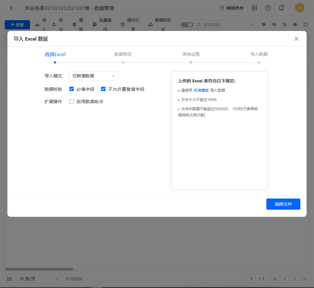 「保存设置」按钮: 点击后,所有已配置的参数(如标题、编辑权限、导入规则等)将被保存到系统中,后续表单操作将按照此次配置执行。