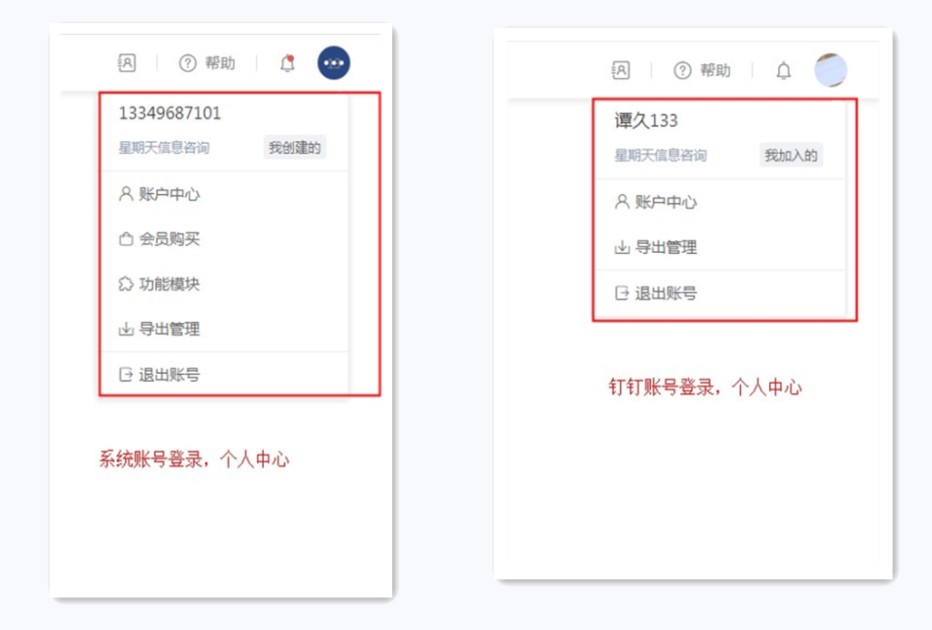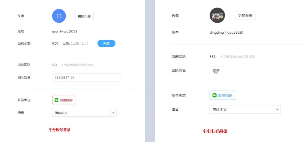 微睿云账号和钉钉扫码登录系统,在个人中心的功能不一致。