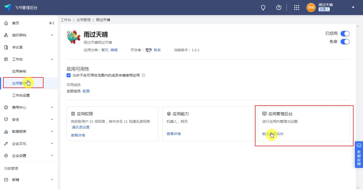 登录飞书管理后台后(https://www.feishu.cn/), 在【工作台】-【应用管理】,找到创建的应用,点击该应用,可直接登录系统。